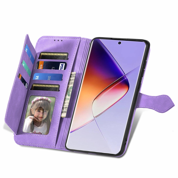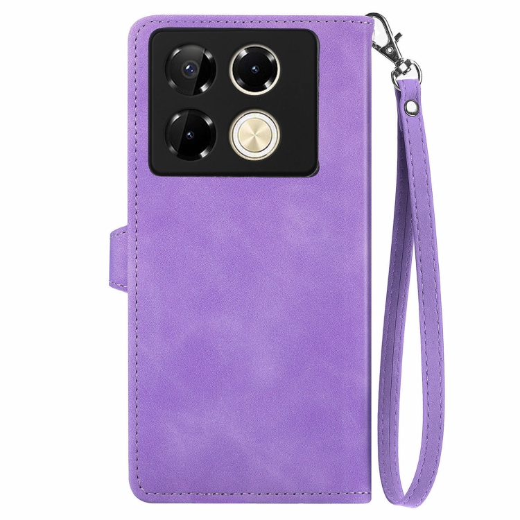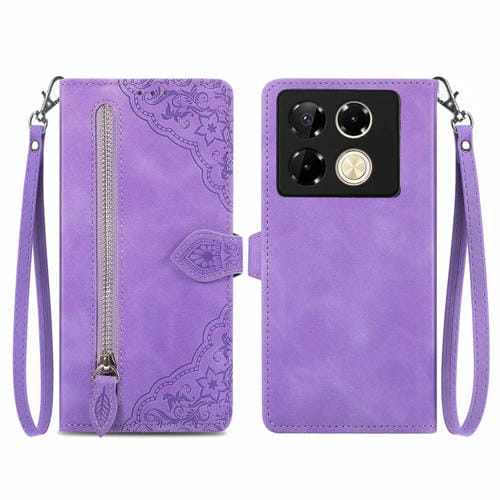 Funda de Cuero para Infinix Note 40 Pro 4G con Cremallera y Flores en Relieve (Púrpura)
