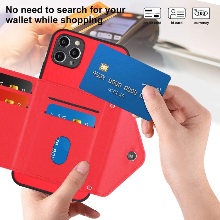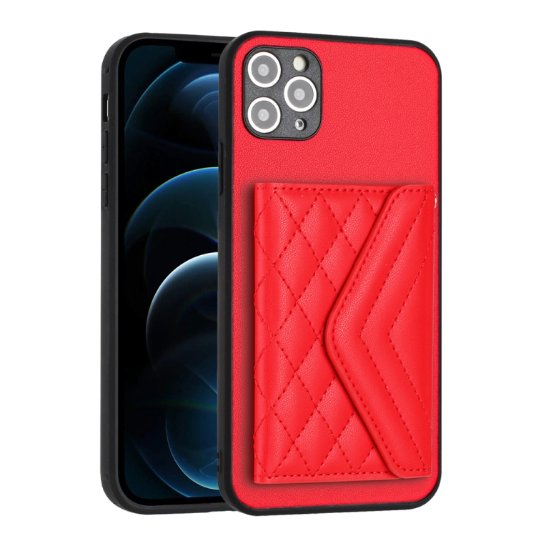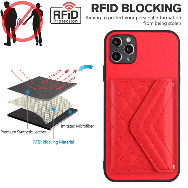 Estuche para teléfono iPhone 11 Pro con bolsa para tarjetas Rfid textura rómbica y cordón largo (Rojo)