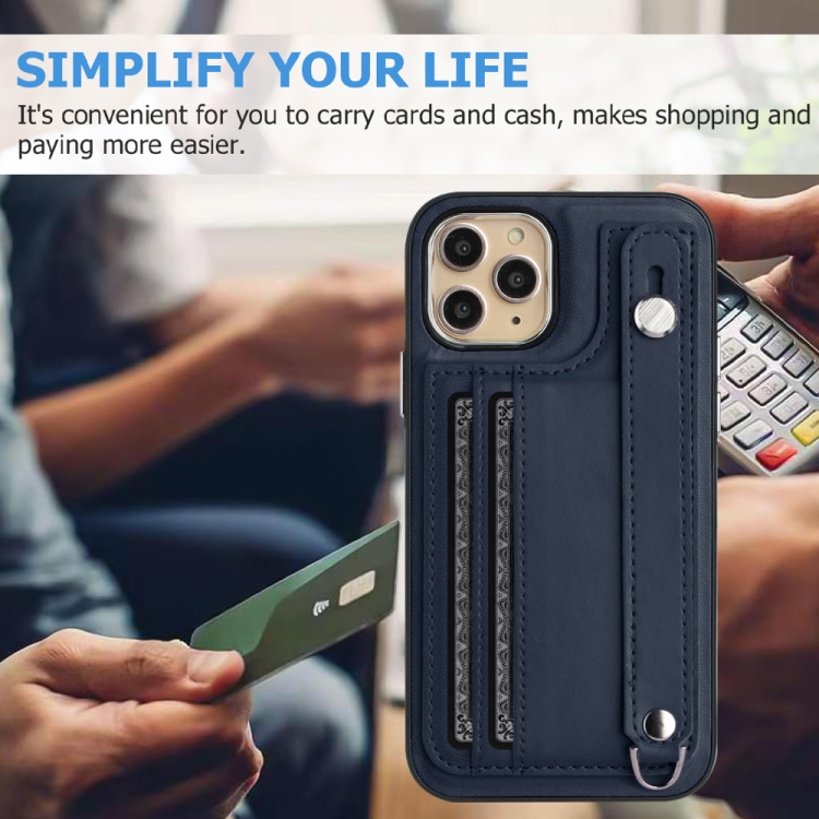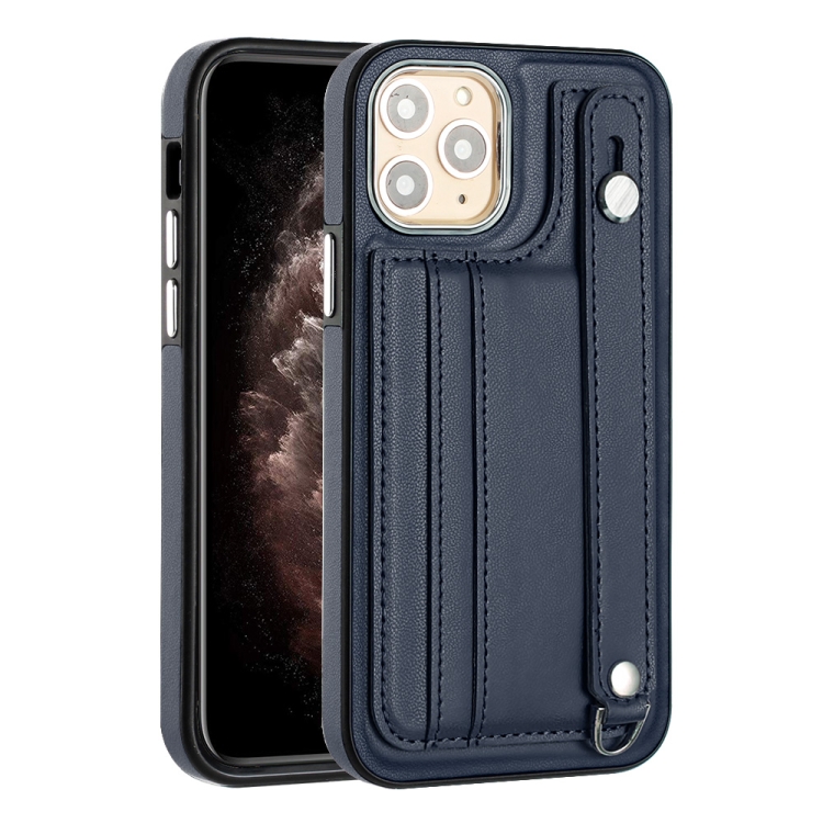 Funda de teléfono iPhone 11 Pro cuero a prueba de golpes con correa para muñeca (Azul)