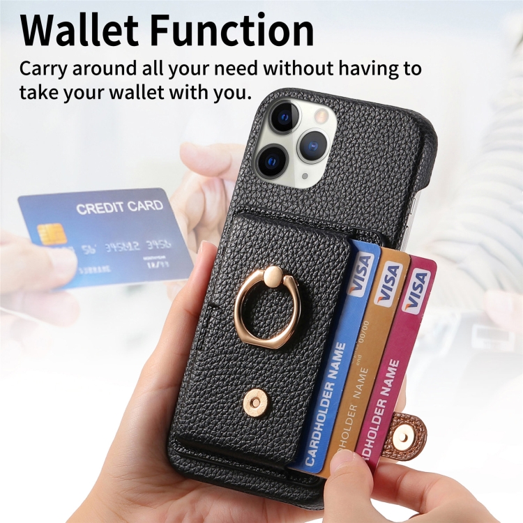 Funda para Teléfono iPhone 11 Pro con Parte Posterior de Tarjeta y Anillo de Cuero Litchi (Negro)