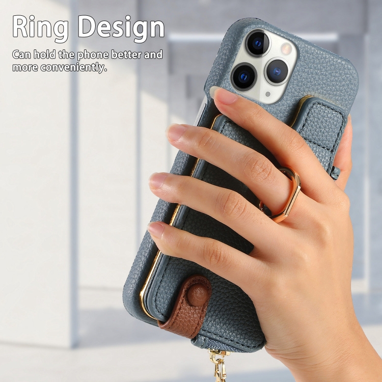 Funda Trasera para iPhone 11 Pro con Billetera, Cremallera y Anillo de Cuero Litchi (Azul Claro)