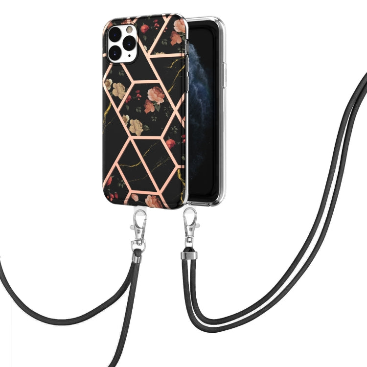 Estuche TPU para iPhone 11 Pro Galvanoplastia Empalme Mármol Patrón de Flores a Prueba de Golpes con Cordón (Flor Negra)