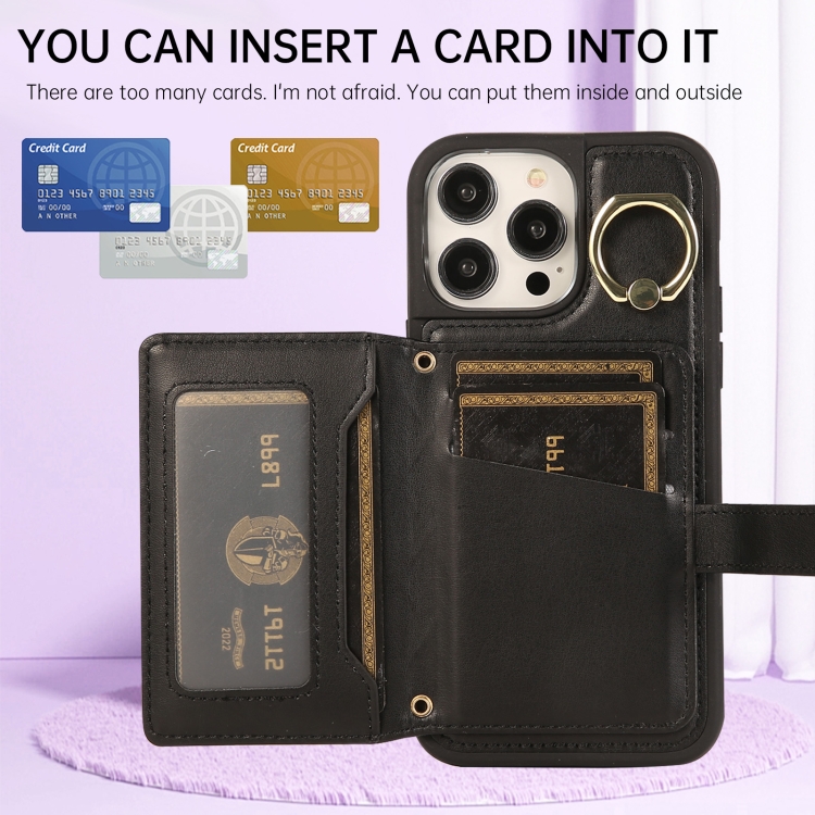 Funda para iPhone 11 Pro Horizontal Card Bag Ring Holder con Doble Cordón (Negro)