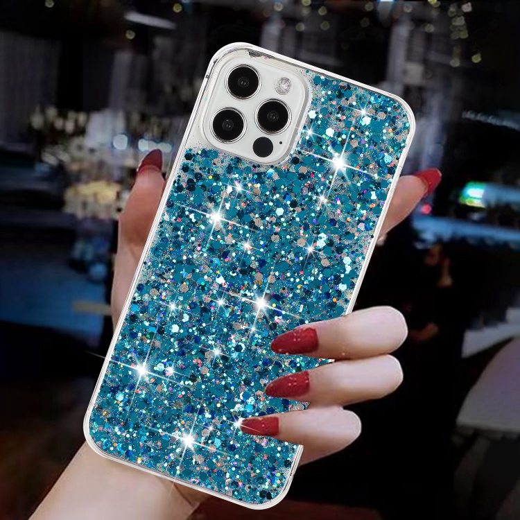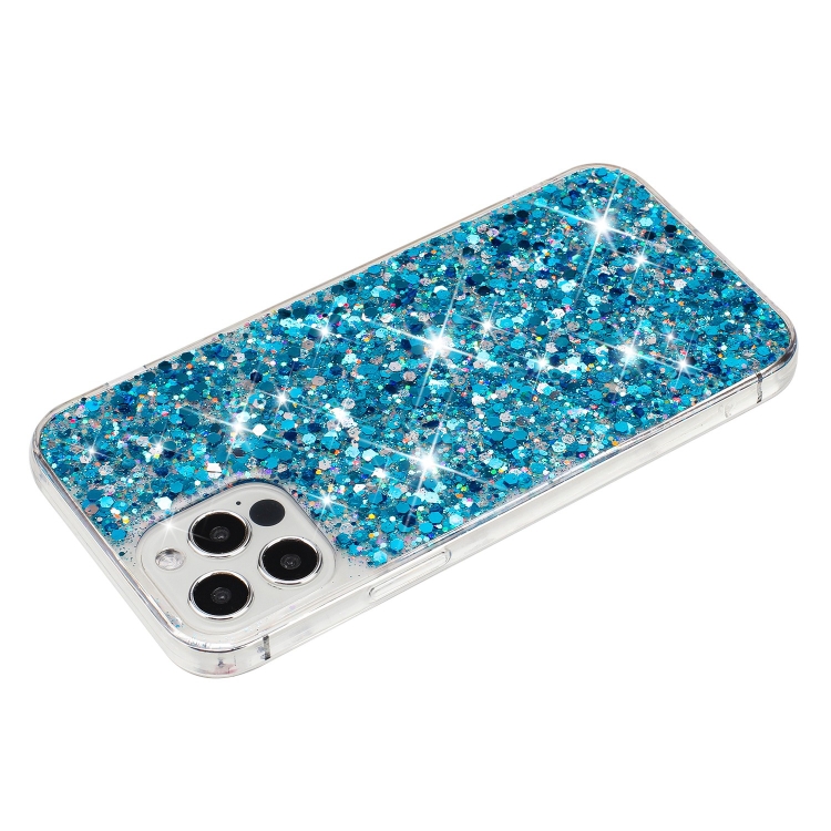 Caja de teléfono TPU para iPhone 11 Pro Max con polvo de brillo y marco Transparente (Azul)