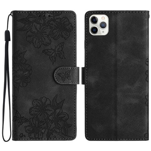 Funda para iPhone 11 Pro Max Cherry Blossom Butterfly Skin Feel de PU En Relieve (Negro)