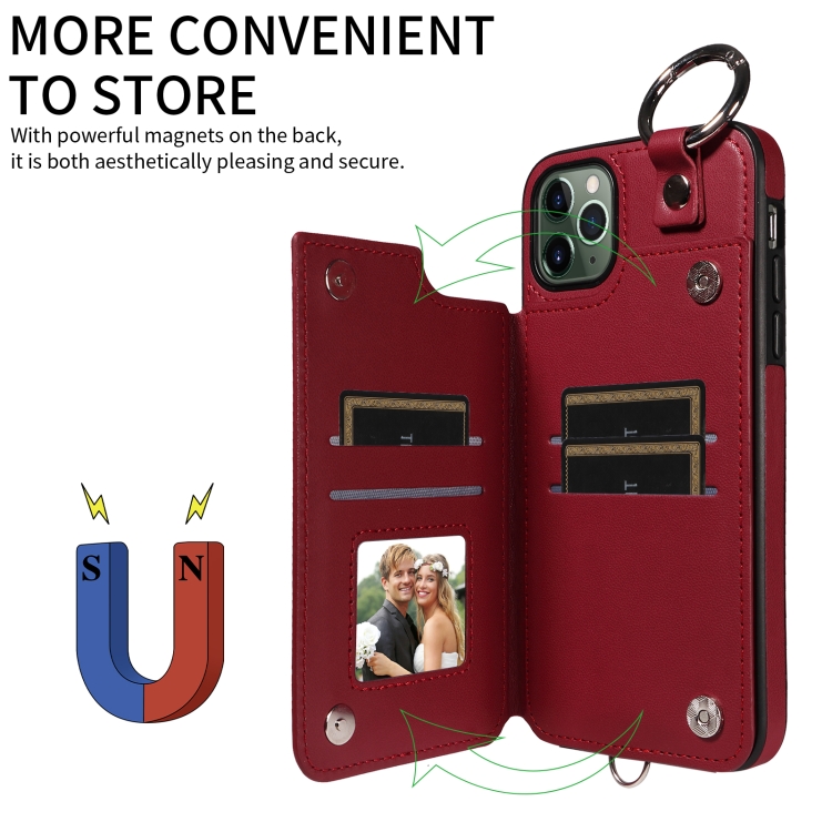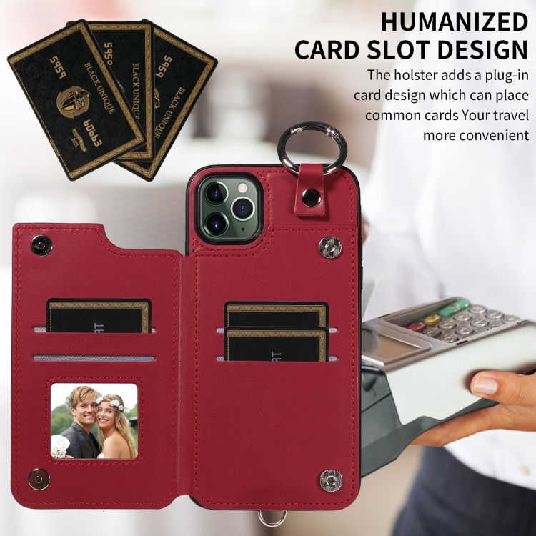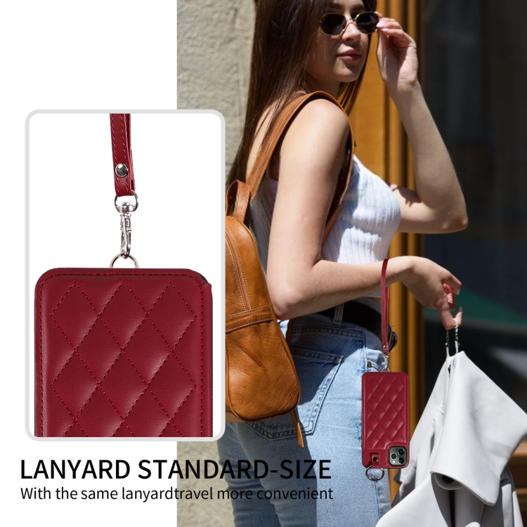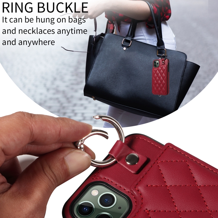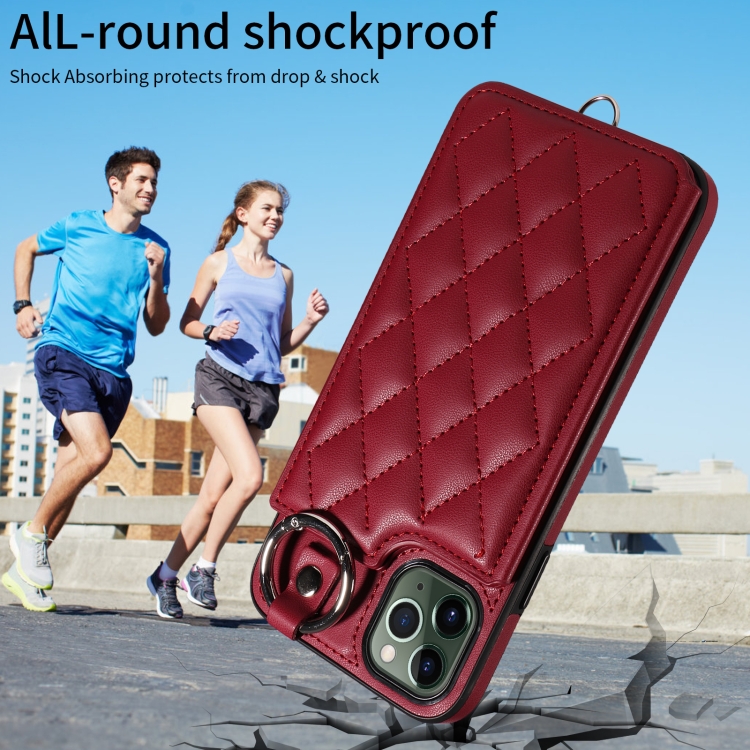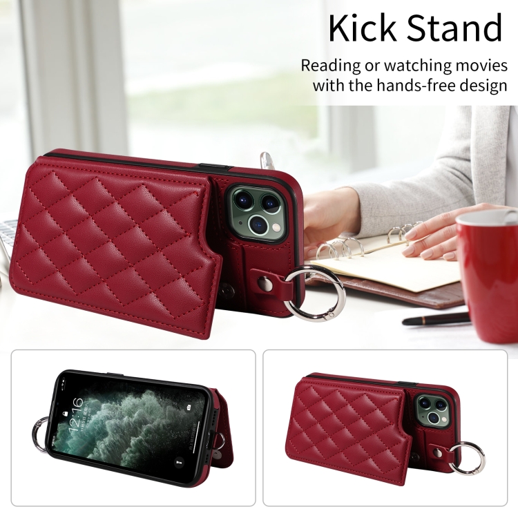 Estuche para Teléfono iPhone 11 Pro Max con Bolsa para Tarjetas Textura Rómbica y Cordón Corto (Rojo Vino)