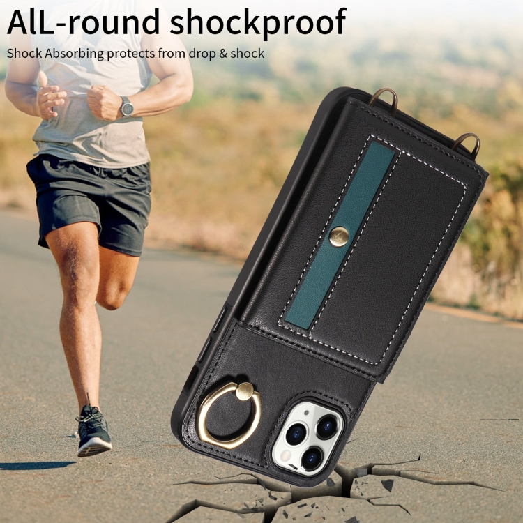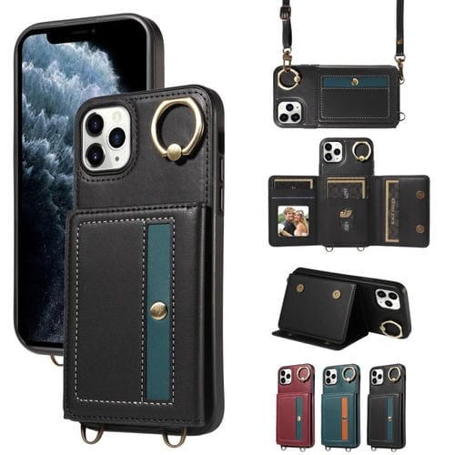 Funda para iPhone 11 Pro Max de Cuero con Soporte para Anillo y Bolso Cruzado para Tarjetas (Negro)