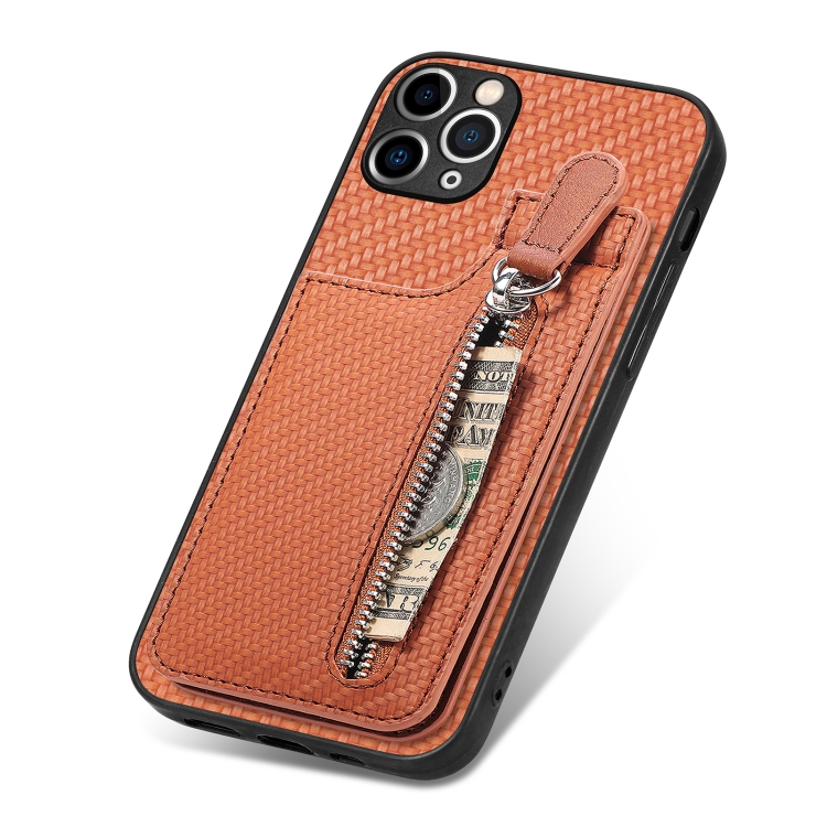 Funda de teléfono iPhone 11 Pro Max Fibra de carbono con cremallera vertical (Marrón)