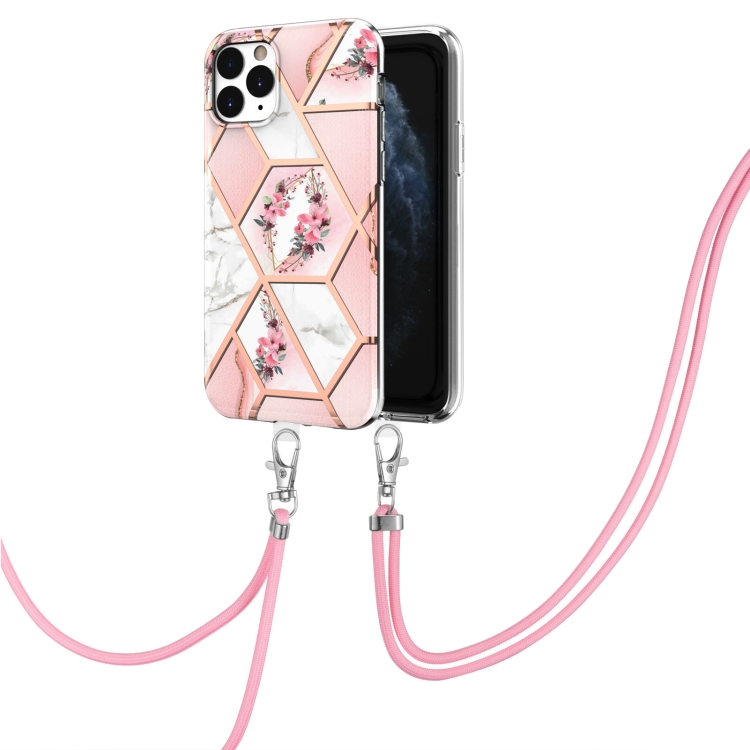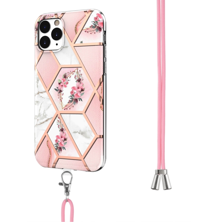 Estuche TPU para iPhone 11 Pro Max Galvanoplastia Empalme Mármol Patrón de Flores a Prueba de Golpes con Cordón (Flor Rosa)