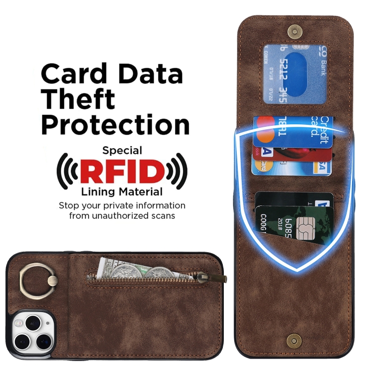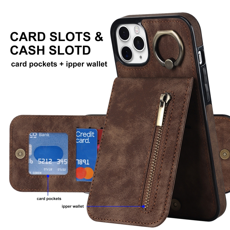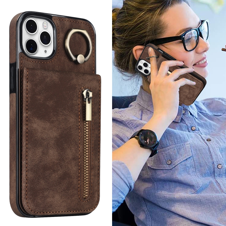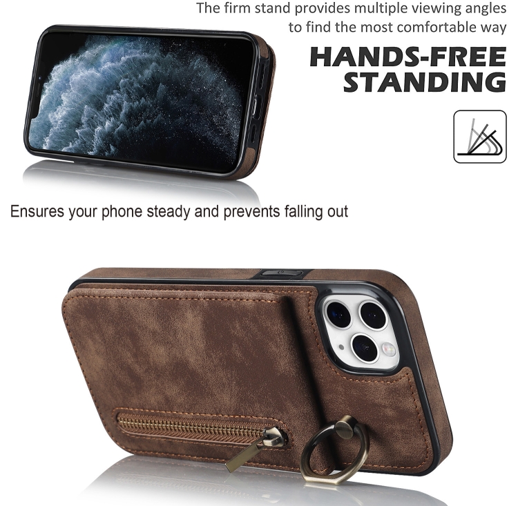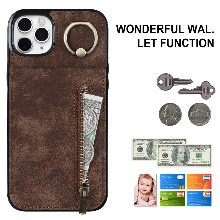 Funda para iPhone 11 Pro Max Retro Ring y Zipper con Ranura RFID (Marrón)