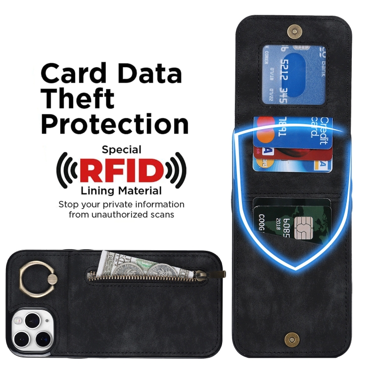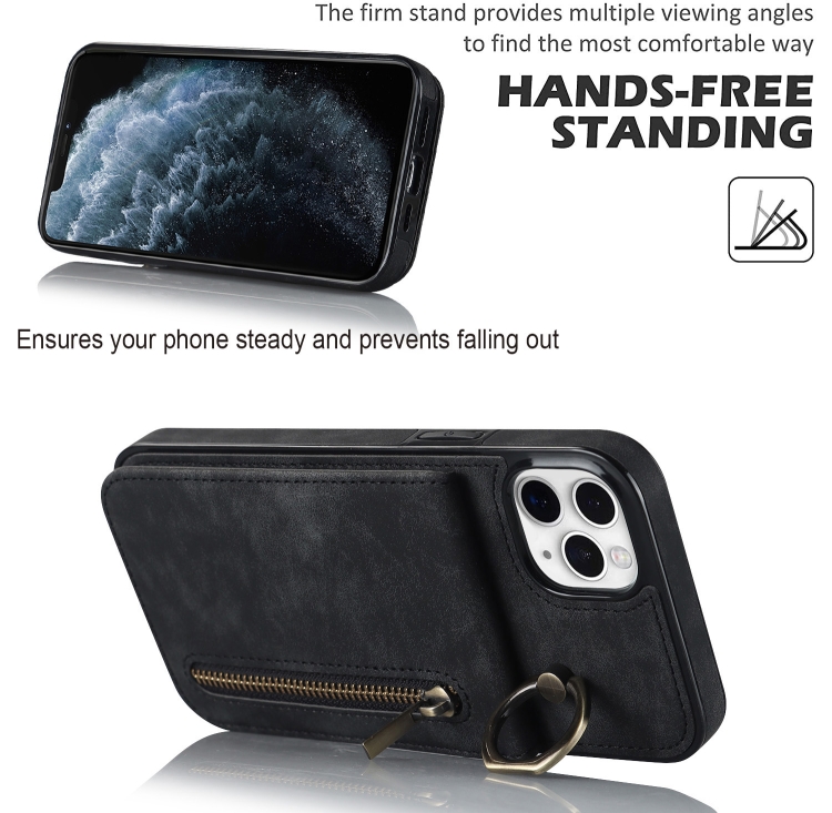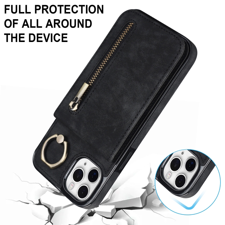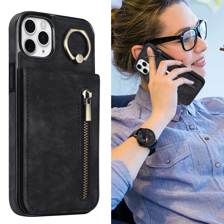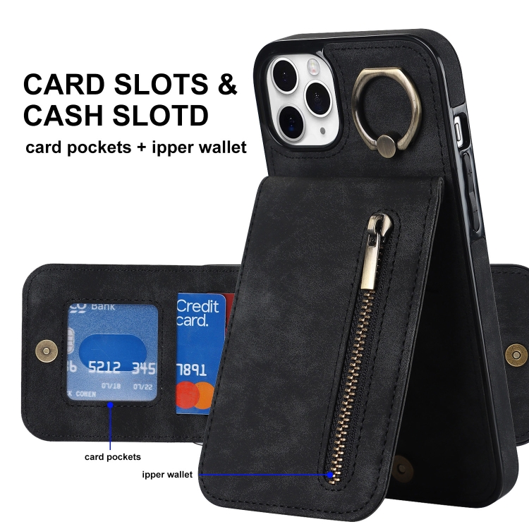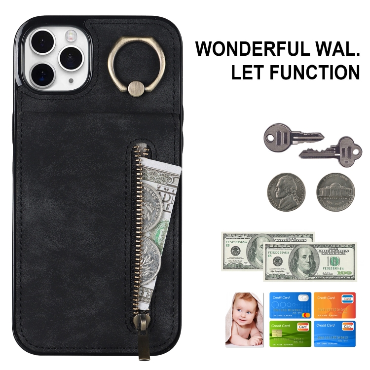 Funda para iPhone 11 Pro Max Retro Ring y Zipper Rfid Card Slot (Negro)