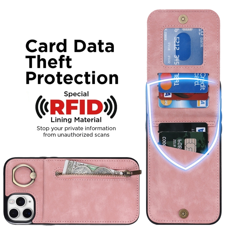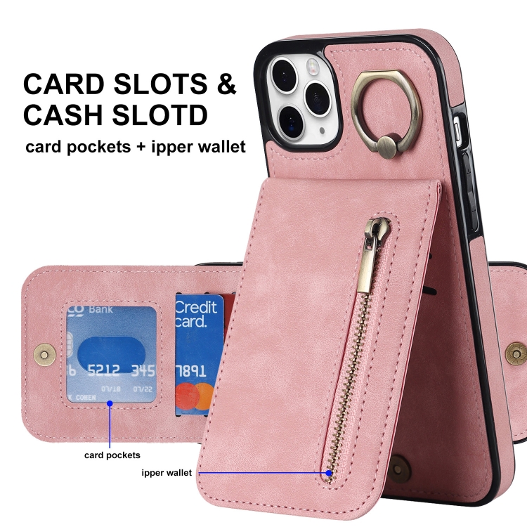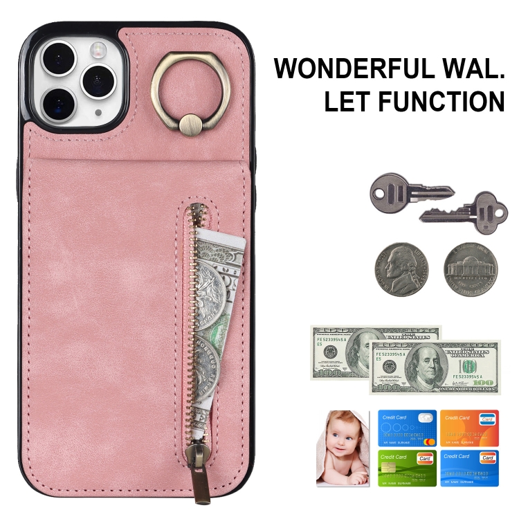 Funda para iPhone 11 Pro Max Retro Ring y Zipper Rfid Card Slot (Rosa)