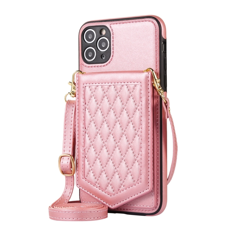 Funda para iPhone 11 Pro Max Rhombic Texture Rfid con Cordón y Espejo (Oro Rosa)