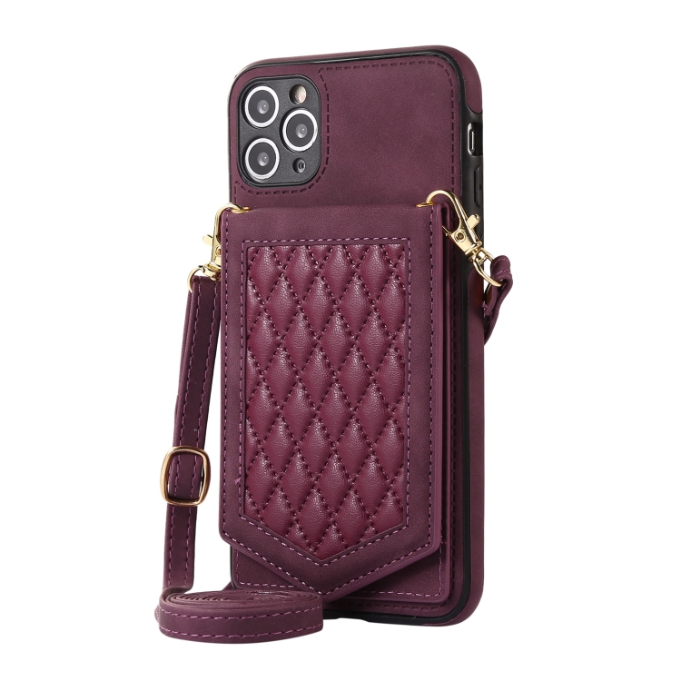 Funda para iPhone 11 Pro Max Rhombic Texture Rfid con Cordón y Espejo (Rojo Vino)