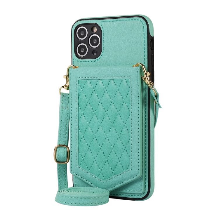 Funda para iPhone 11 Pro Max Rhombic Texture Rfid con Cordón y Espejo (Verde Menta)