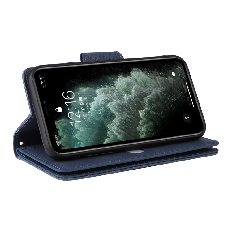 Funda de Cuero para iPhone 11 Pro Max Rivet Buckle Tres Pliegues 9 Cards (Azul)