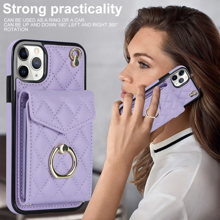 Funda para Teléfono iPhone 11 Pro Rhombic Texture Card Bag con Cordón Largo (Púrpura Claro)