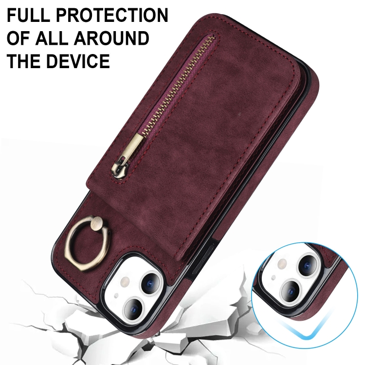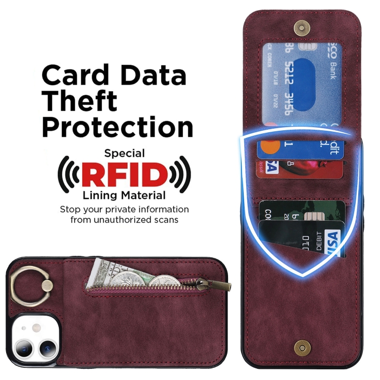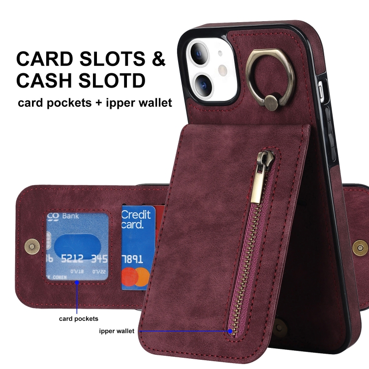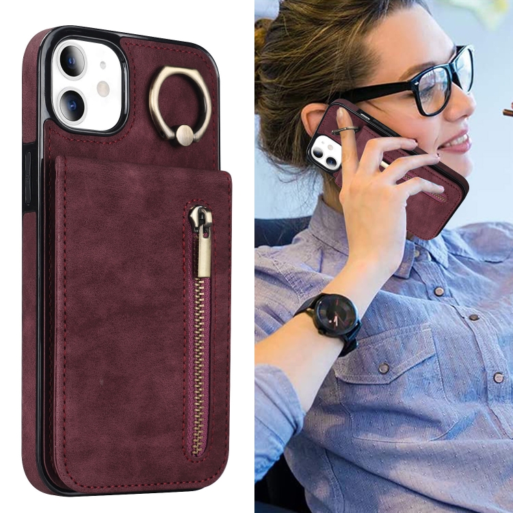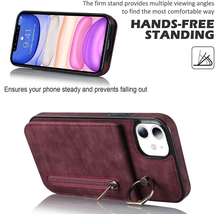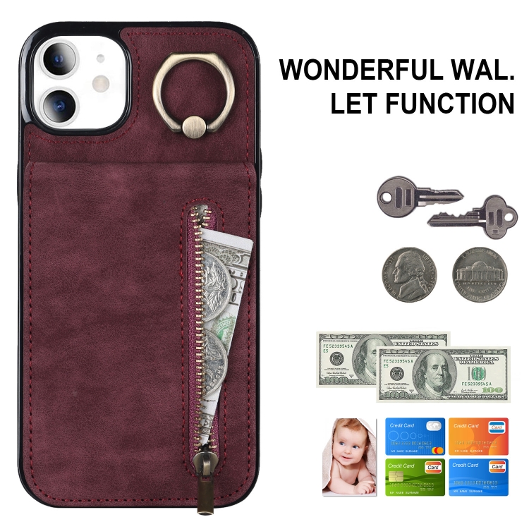 Estuche para Teléfono iPhone 11 Retro Ring And Zipper Ranura para Tarjeta Rfid (Rojo Vino)
