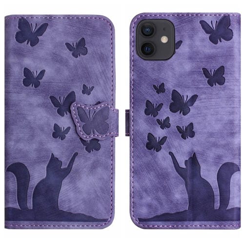 Funda de cuero para iPhone 12/12 Pro Butterfly Cat con tapa en relieve (Púrpura)