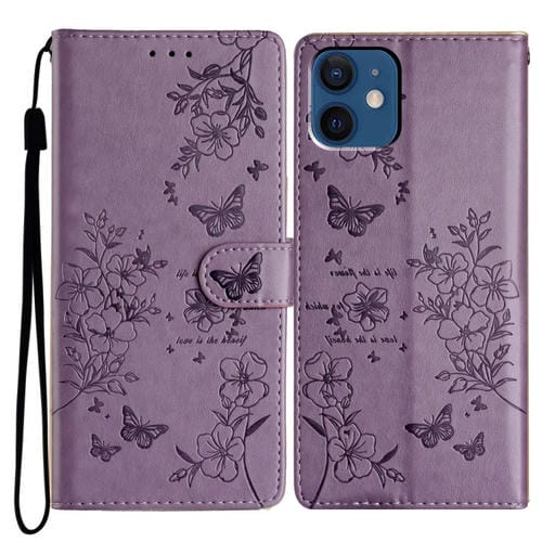 Funda para Teléfono iPhone 12/12 Pro Cuero Relieve Flor de Amor y Mariposa (Púrpura)