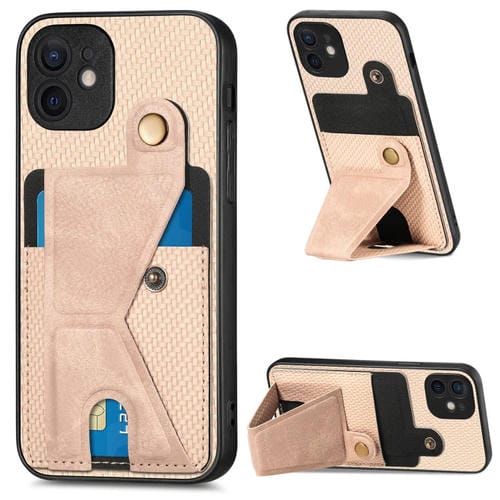 Funda Cartera para iPhone 12 Fibra de Carbono Flip Card con Soporte en Forma de K (Caqui)