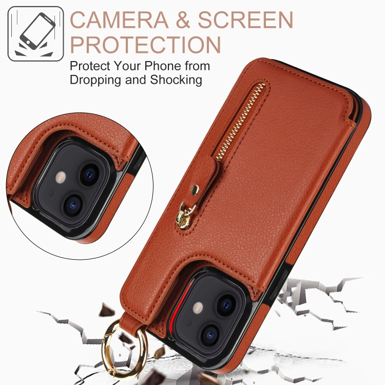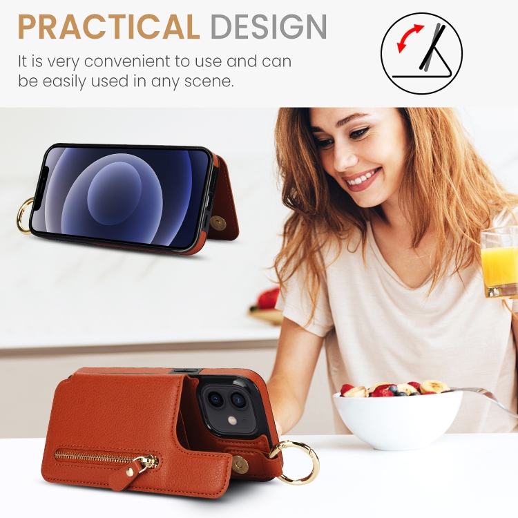 Funda para Teléfono iPhone 12 con Bolsa para Tarjetas Doble Hebilla y Cremallera (Marrón)