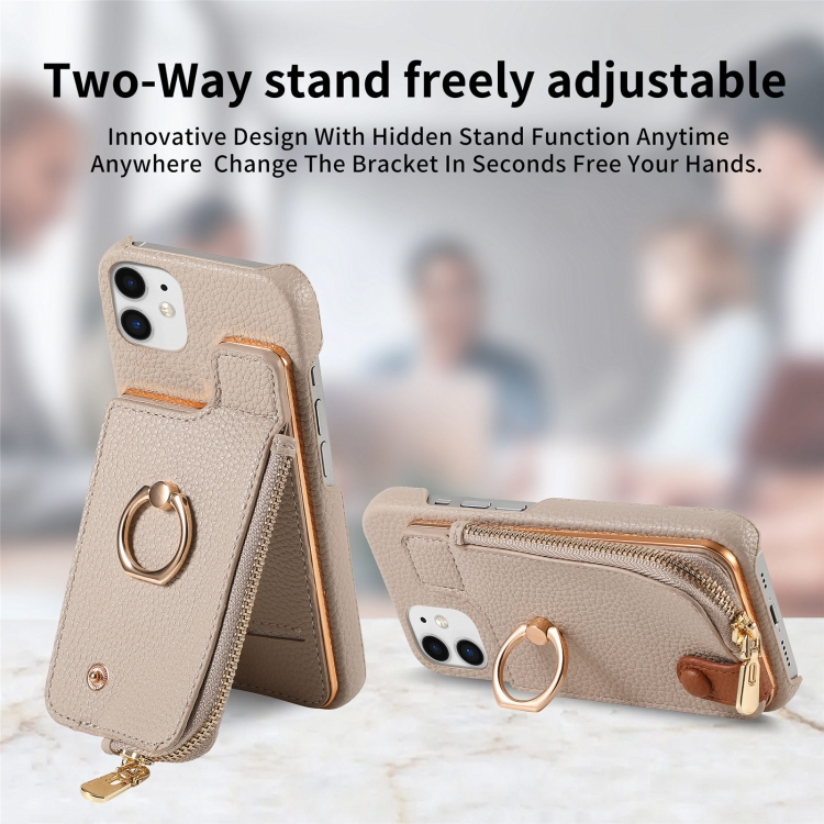 Funda Trasera para iPhone 12 con Billetera, Cremallera y Anillo de Cuero Litchi (Caqui)