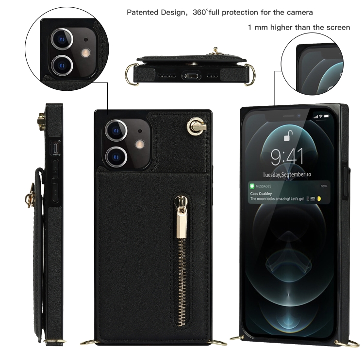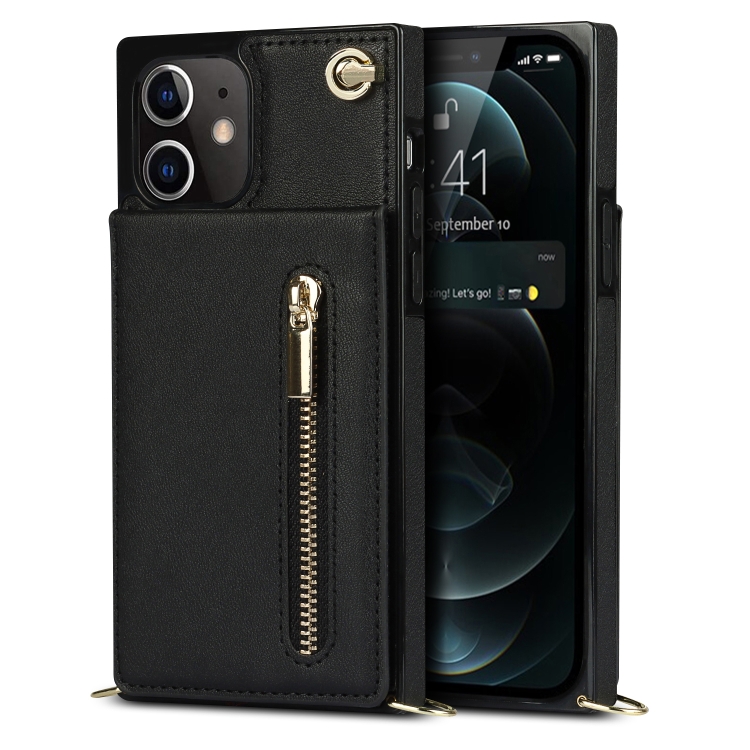 Funda Trasera para iPhone 12 Mini Cross-Body Zipper Square TPU + PU con Soporte, Ranuras para Tarjetas y Correa (Negro)