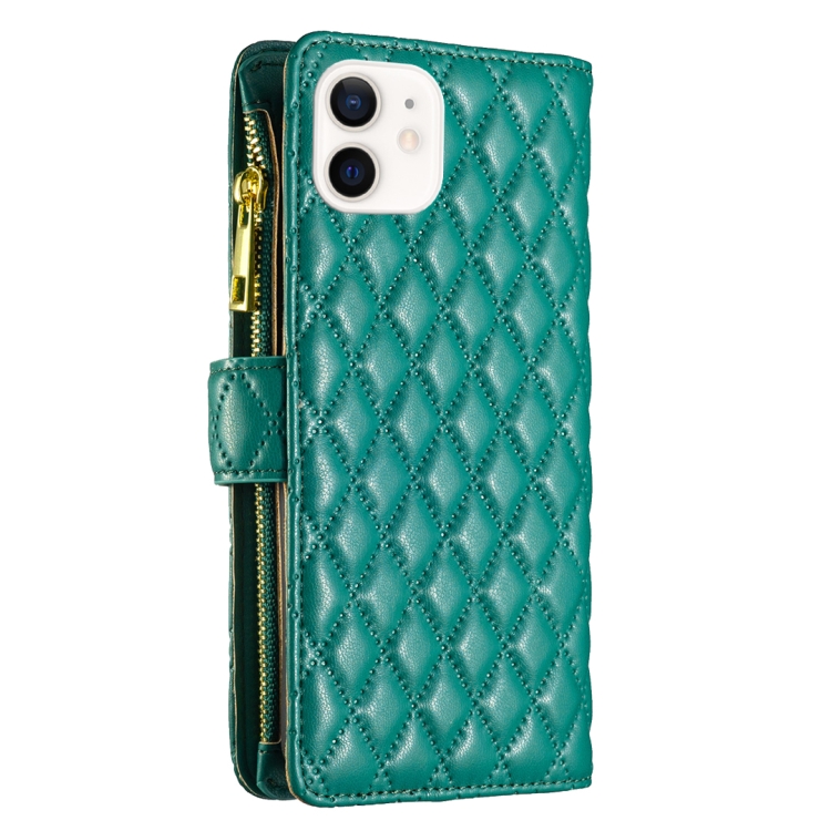 Funda de Cuero para iPhone 12 Mini Diamond Lattice Zipper Wallet con Tapa (Verde)