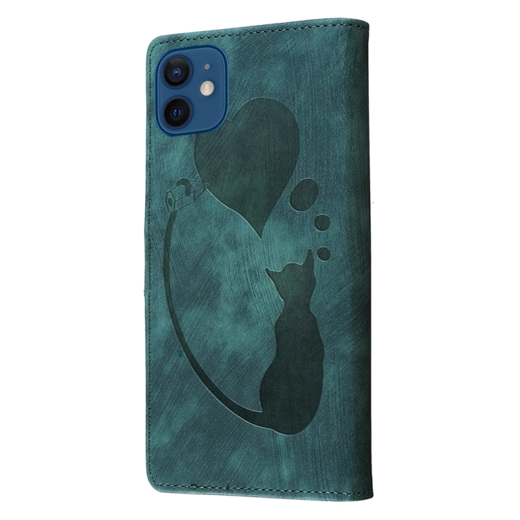 Funda para iPhone 12 Mini Pen Heart Cat de Cuero con Relieve (Verde)