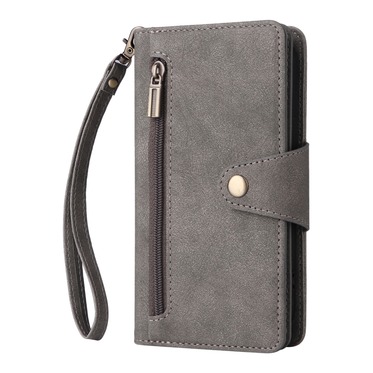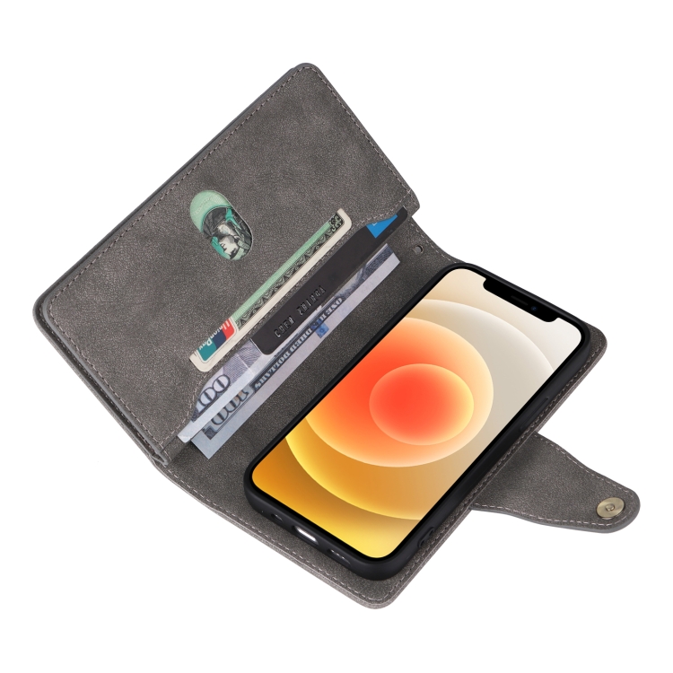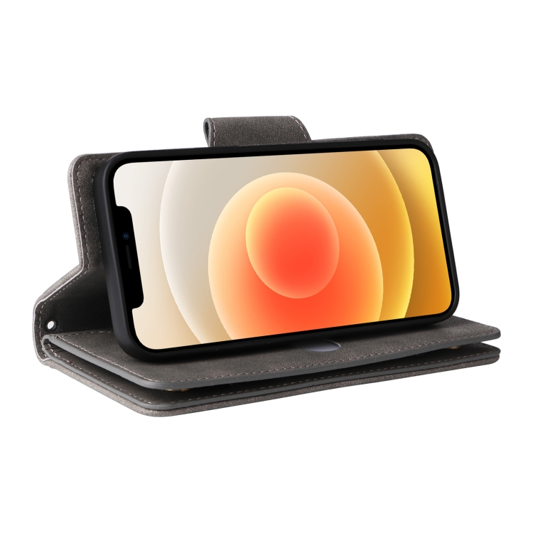 Funda de Cuero para iPhone 12 Mini Rivet Buckle Tres Pliegues 9 Cards (Gris)
