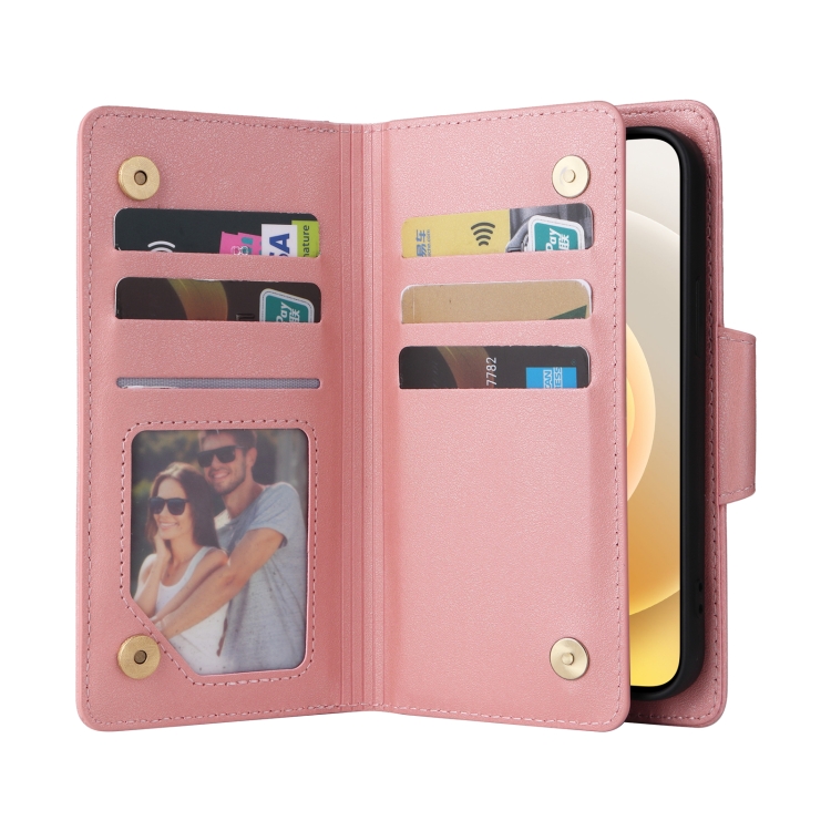 Funda de Cuero para iPhone 12 Mini Rivet Buckle 9 Cards Tres Pliegues (Oro Rosa)