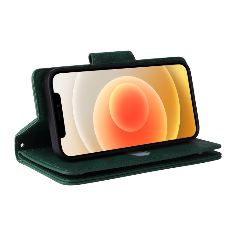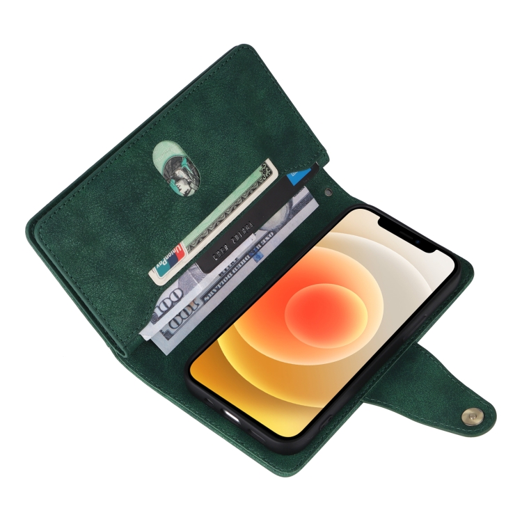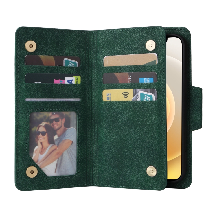 Funda de Cuero para Teléfono iPhone 12 Mini Rivet Buckle 9 Cards Tres Pliegues (Verde)