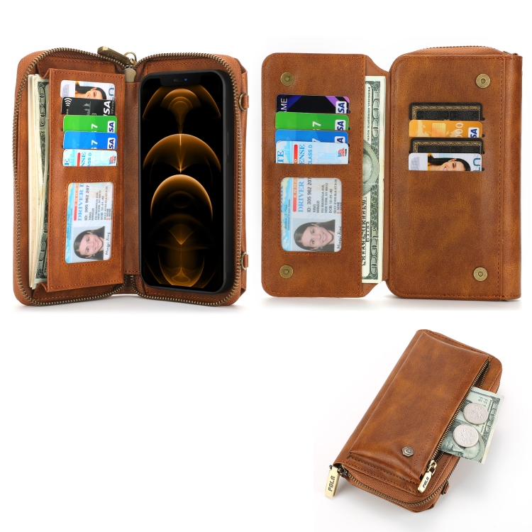 Funda para iPhone 12 Pro Crossbody de Cuero con Billetera y Cremallera Multifuncional (Marrón)