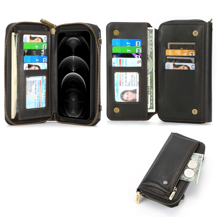 Funda para iPhone 12 Pro Crossbody de Cuero con Billetera y Cremallera Multifuncional (Negro)