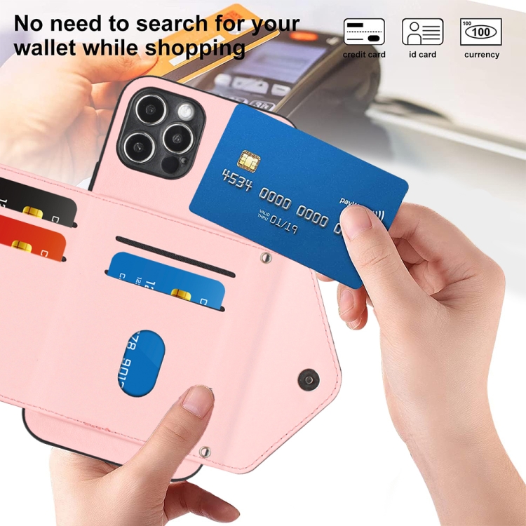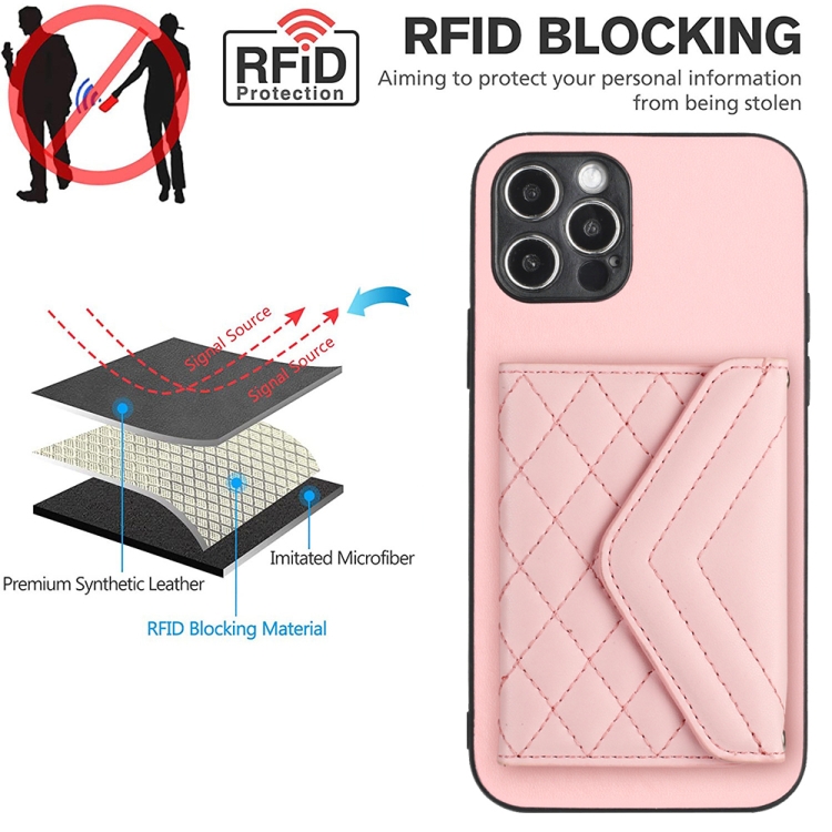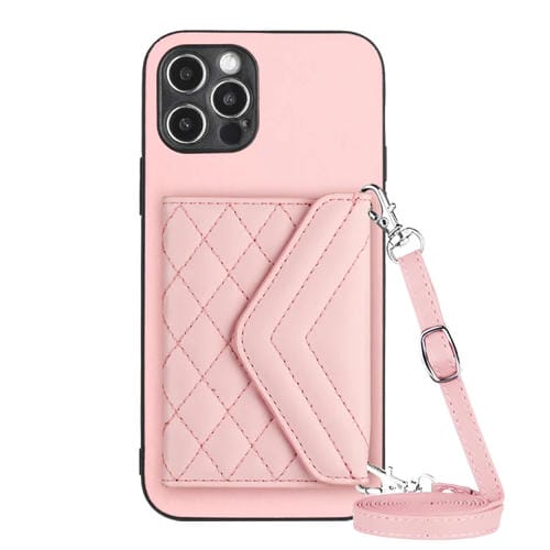 Estuche para Teléfono iPhone 12 Pro con Bolsa para Tarjetas Rfid Textura Rómbica Cordón Largo (Oro Rosa)