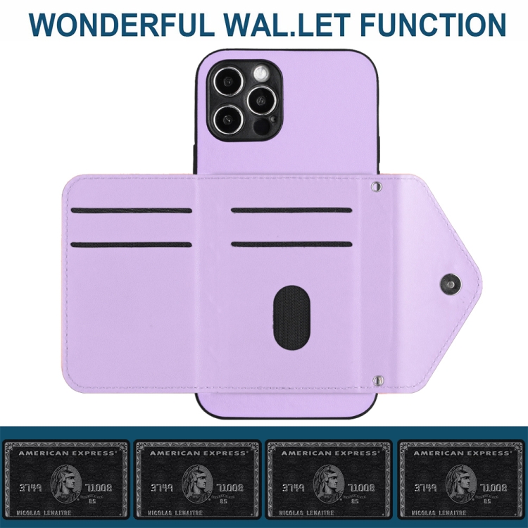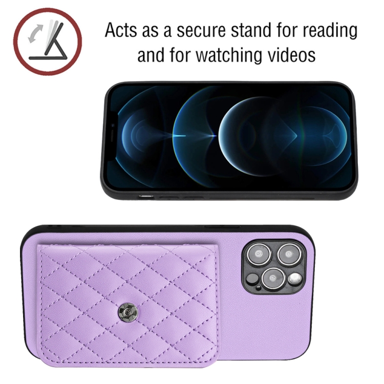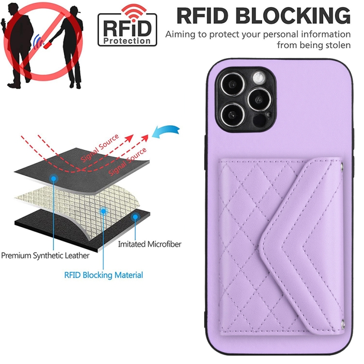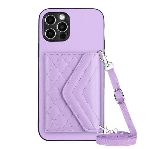 Estuche para Teléfono iPhone 12 Pro Rfid con Bolsa para Tarjetas Textura Rómbica y Cordón Largo (Púrpura Claro)