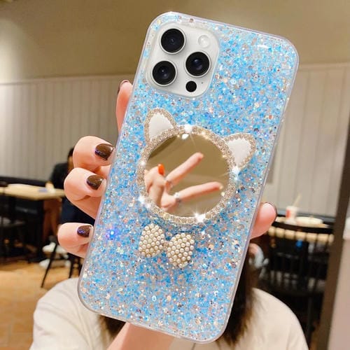 Funda para Teléfono TPU Epoxi iPhone 12 Pro con Espejo Orejas de Gato Lentejuelas Estrelladas (Azul)