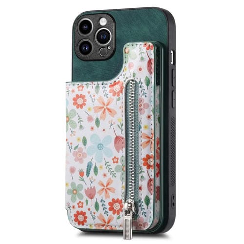 Funda Trasera para iPhone 12 Pro con Billetera y Cremallera Pintada Retro (Verde)