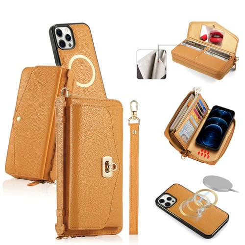 Funda para Teléfono iPhone 12 Pro Magsafe Crossbody Cartera Multifuncional con Cremallera de Cuero Litchi (Naranja)