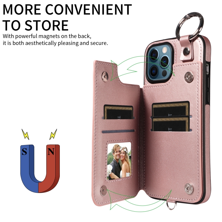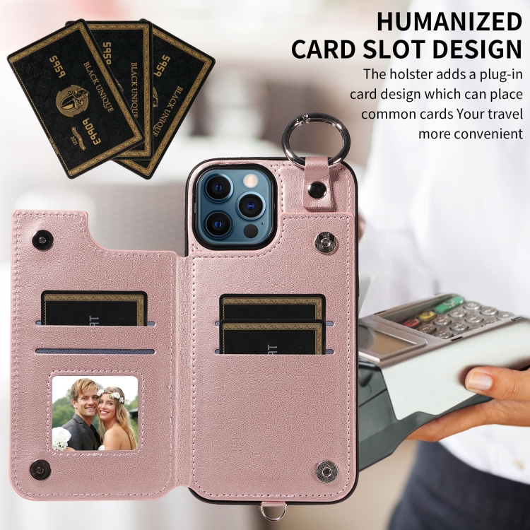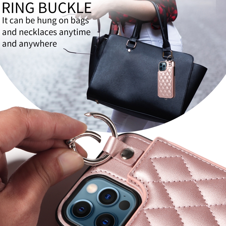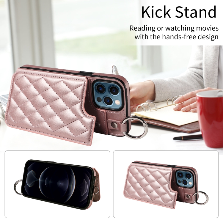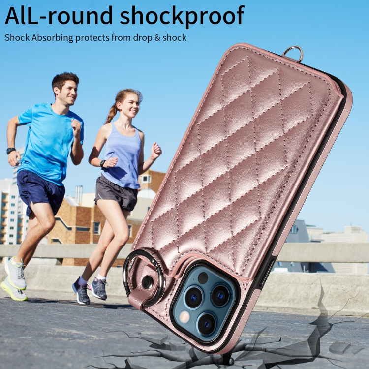 Estuche para Teléfono iPhone 12 Pro Max con Bolsa para Tarjetas Textura Rómbica y Cordón Corto (Oro Rosa)