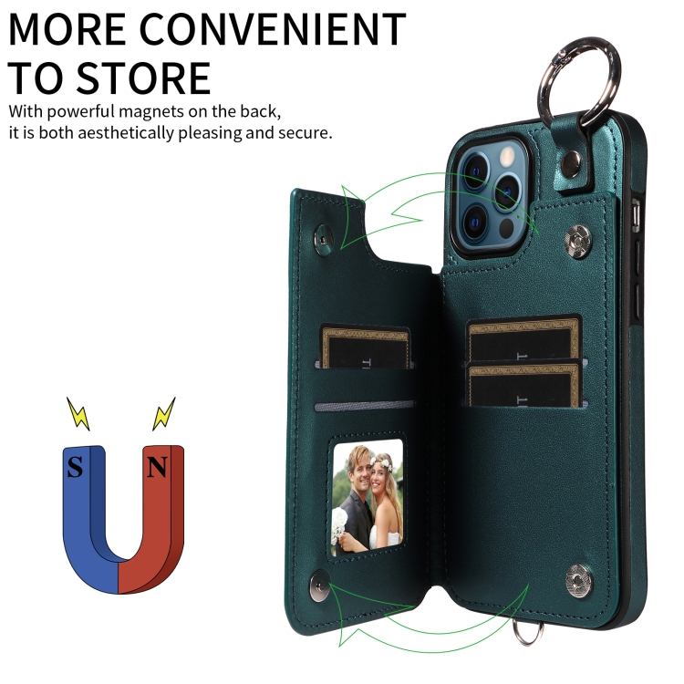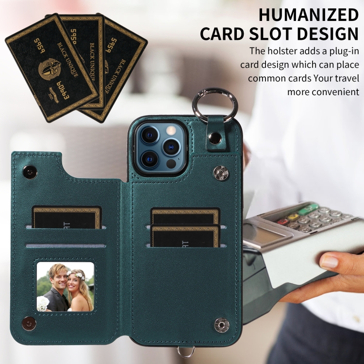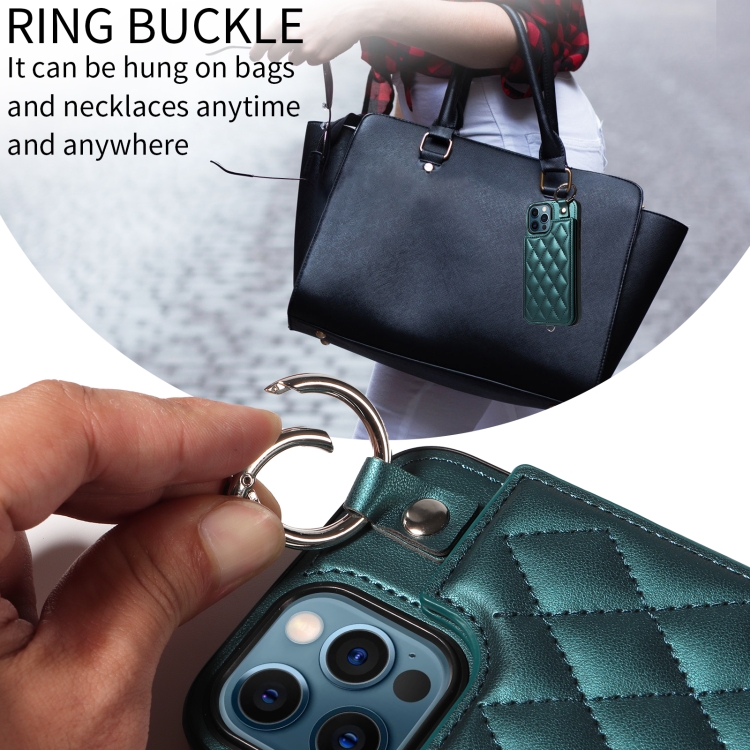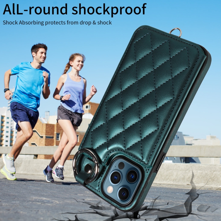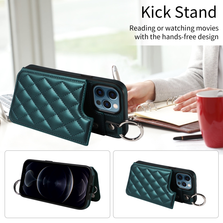 Estuche para Teléfono iPhone 12 Pro Max con Bolsa para Tarjetas Textura Rómbica y Cordón Corto (Verde)