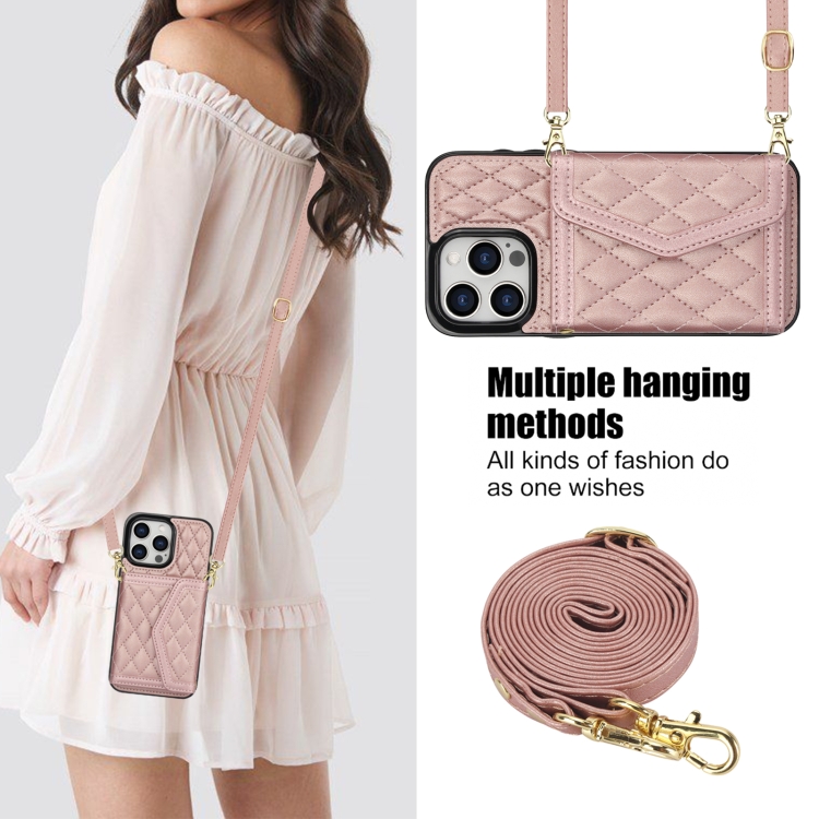 Estuche para Teléfono iPhone 12 Pro Max con Bolsa para Tarjetas Textura Rómbica Empalme Cordón Largo (Oro Rosa)