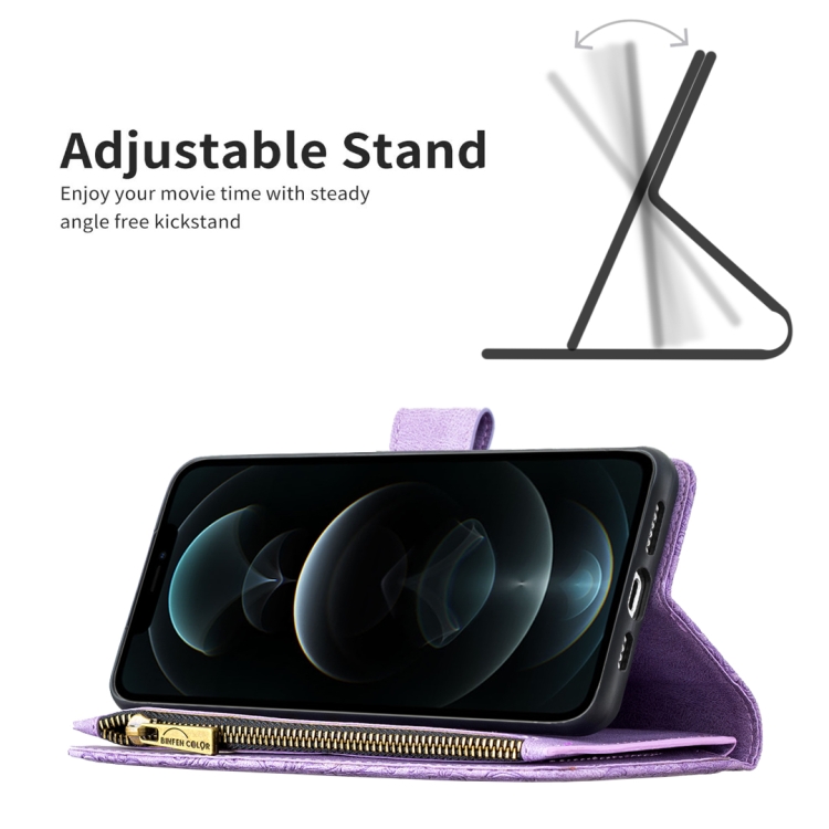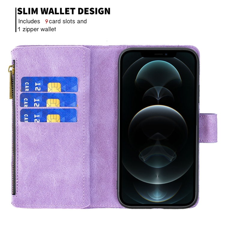 Funda de cuero para iPhone 12 Pro Max Flying Butterfly con patrón de relieve, cremallera, soporte, tragamonedas y billetera (Púrpura)