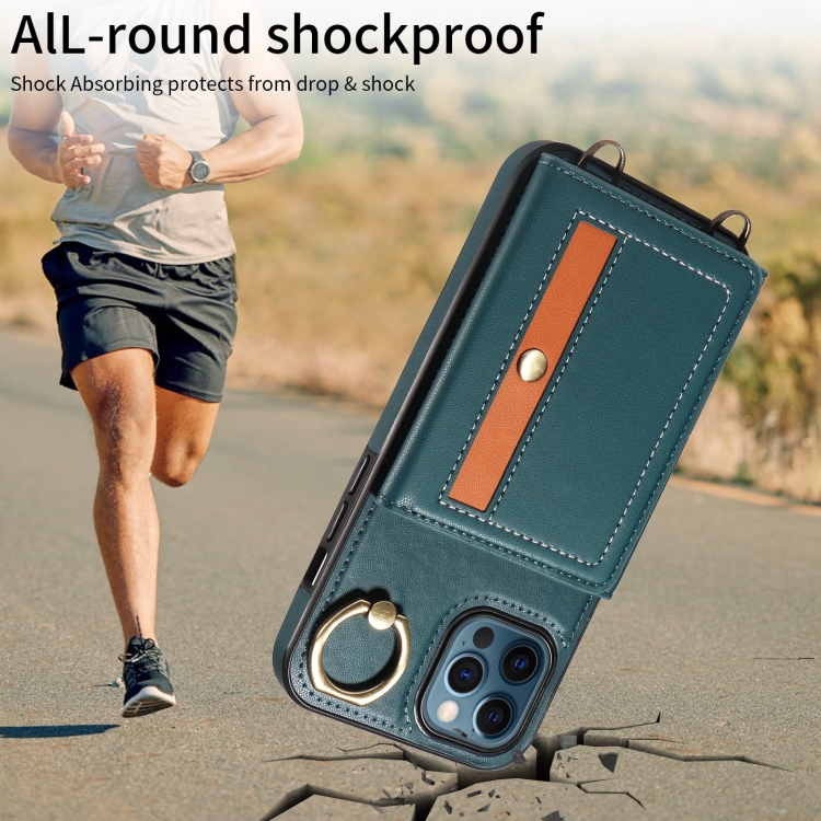 Funda de Cuero para Teléfono iPhone 12 Pro Max Soporte para Anillo y Bolso Cruzado para Tarjeta (Verde)