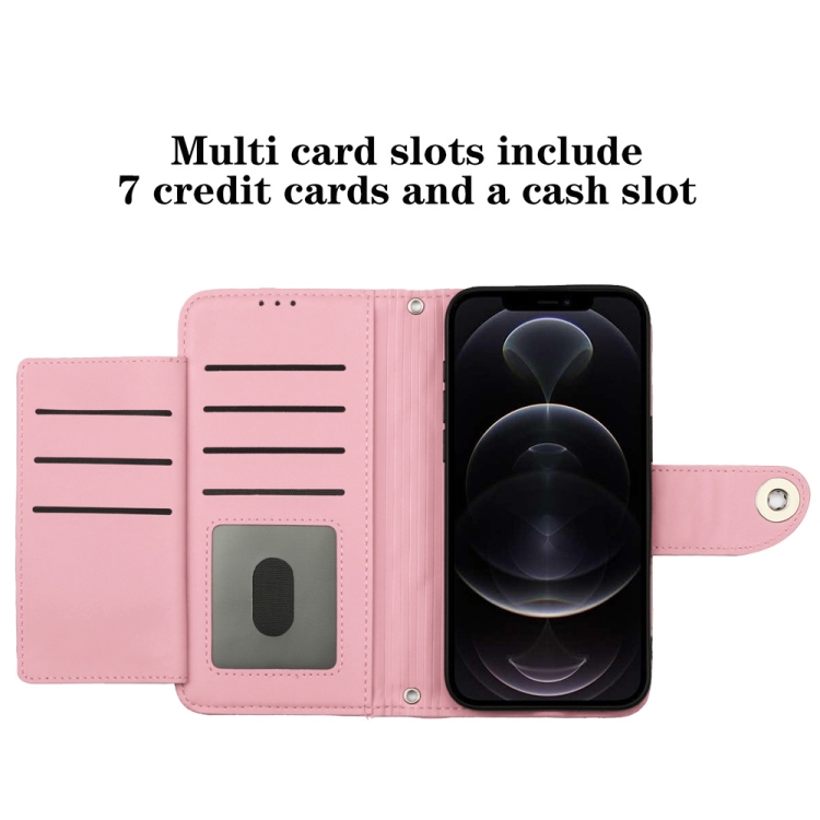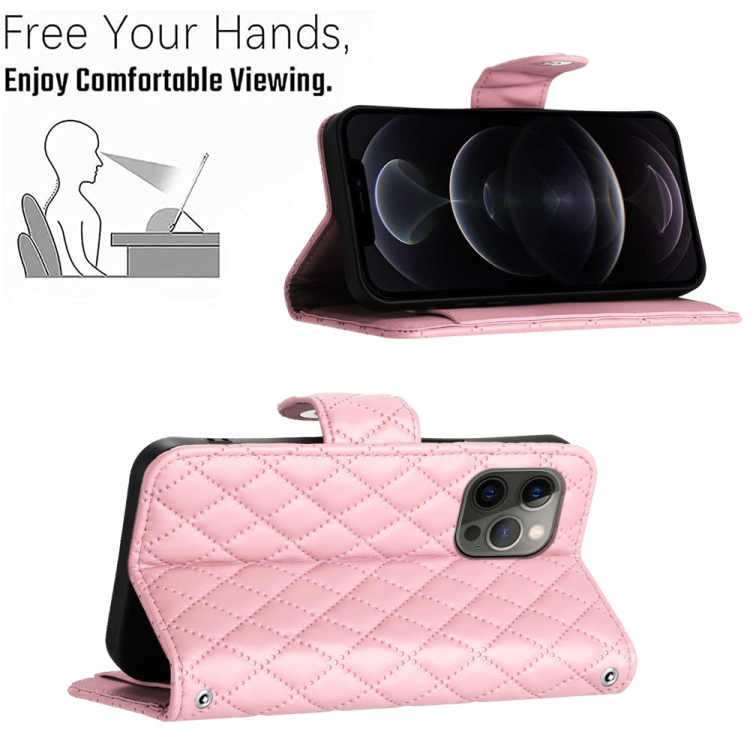 Funda para Teléfono iPhone 12 Pro Max con Tapa de Cuero Textura Rómbica y Cordón Largo (Rosa)