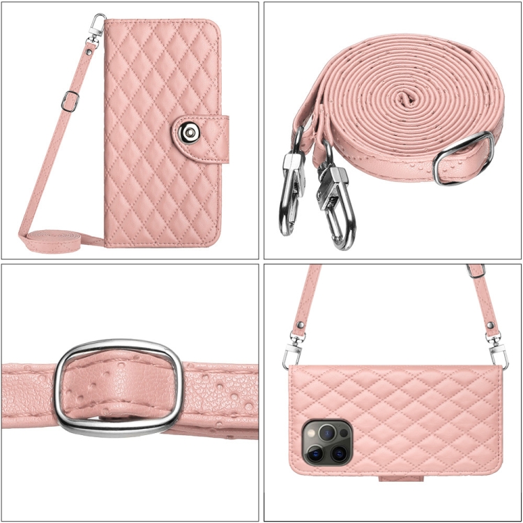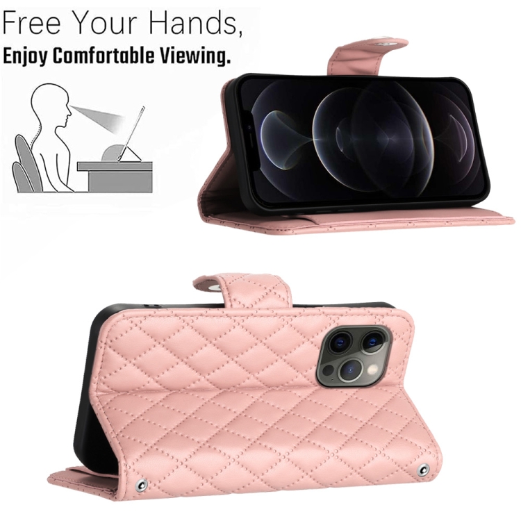 Funda para Teléfono iPhone 12 Pro Max con Tapa de Cuero Textura Rómbica y Cordón Largo (Rosa Coral)