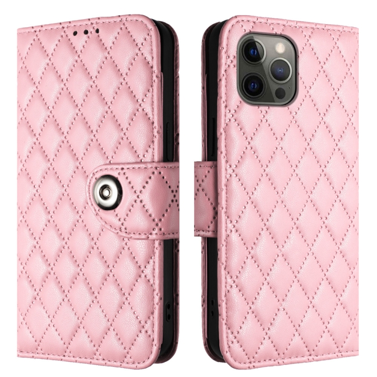 Funda para Teléfono iPhone 12 Pro Max con Tapa de Cuero Textura Rómbica y Cordón (Rosa)