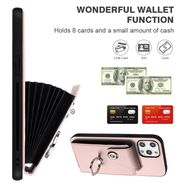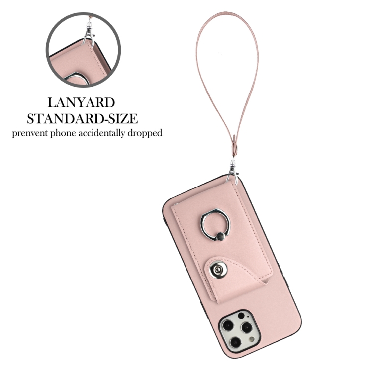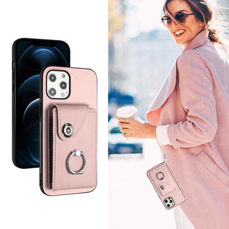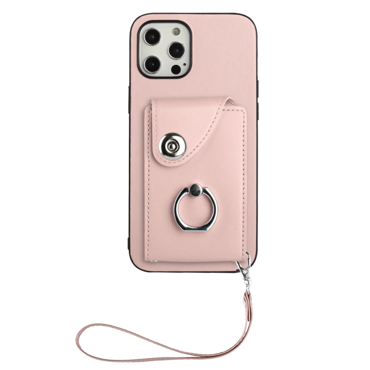 Funda para Teléfono iPhone 12 Pro Max PU con Soporte para Anillo y Bolsa para Tarjeta con Cordón (Rosa)