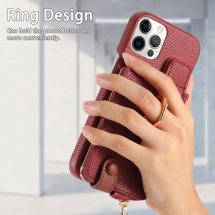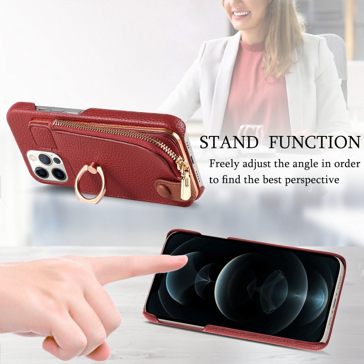 Funda Trasera para iPhone 12 Pro Max con Billetera, Cremallera y Anillo de Cuero Litchi (Rojo)